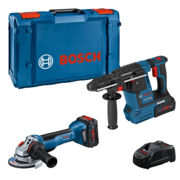 Акумулаторният комплект BOSCH GBH 18V-26 + GWS 18V-10 PC + 2xProCORE18V 5,5Ah + GAL 1880 се отличава с висока мощност, дълъг експлоатационен живот и професионална надеждност. Инструментите се захранват от 18 V батерии ProCORE с капацитет 5,5 Ah и се доставят в здрав и удобен куфар XL-BOXX, осигуряващ лесно съхранение и транспортиране. Ъглошлайфът работи с дискове с диаметър 125 mm, развива скорост на празен ход до 9000 об/мин и е оборудван с безчетков мотор, който гарантира по-висока ефективност, по-ниска консумация на енергия и минимална поддръжка. Сред ключовите функции са KickBack Control, Drop Control и PROtection превключвател, които осигуряват максимална безопасност при работа. Перфораторът разполага със захват SDS-plus, сила на удара 2,6 J, скорост на празен ход до 890 об/мин и честота на удара до 4350 уд/мин, което го прави изключително подходящ за пробиване в бетон, зидария и камък.