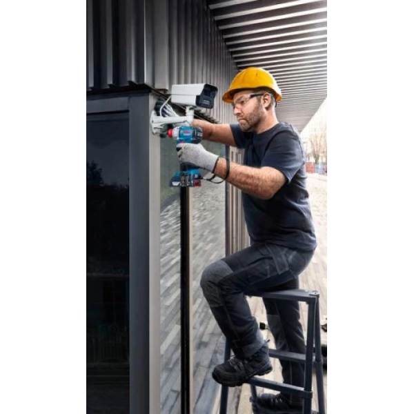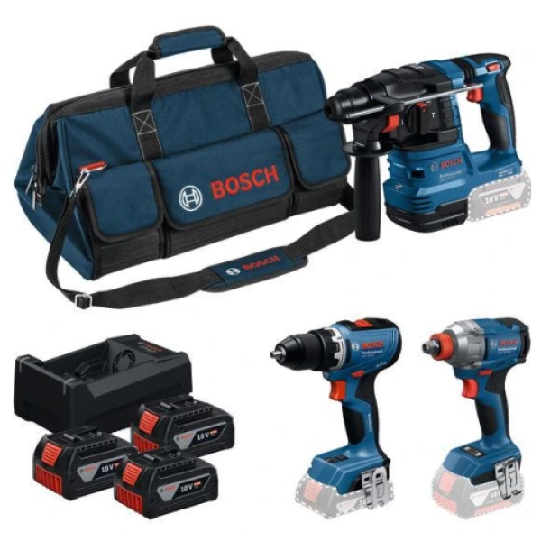 Комплектът акумулаторни инструменти BOSCH 18 V GSR + GDX + GBH включва три високоефективни уреда – винтоверт, ударен гайковерт и перфоратор, които осигуряват надеждност и производителност при професионална употреба. Акумулаторният винтоверт предлага максимален въртящ момент от 63 Nm, скорост на празен ход 2100 об/мин и капацитет на патронника от 1,5 до 13 mm, което го прави подходящ за разнообразни монтажни задачи. Ударният гайковерт развива въртящ момент от 285 Nm при завиване и 500 Nm при развиване, има две скорости и е съвместим с винтове от M8 до M18. Перфораторът осигурява сила на удара 2 J, с честота 4675 удара в минута и скорост на празен ход до 1050 об/мин, гарантирайки ефективно пробиване дори в твърди материали. Комплектът се доставя с три литиево-йонни батерии с капацитет 5,0 Ah, зарядно устройство GAL 12V/18V-80 и удобна чанта за съхранение и транспортиране, осигуряваща практичност и лесно пренасяне на инструментите.