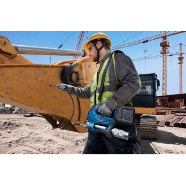 Акумулаторният такаламит BOSCH GFP 18V-10 – Solo е професионален инструмент, създаден за бързо и ефективно смазване на механизми в строителството, селското стопанство, железопътната поддръжка и индустриалните приложения. Работи с 18 V батерия (не е включена) и осигурява надеждна работа дори при по-тежки натоварвания. Маркучът с дължина 1200 mm улеснява достъпа до труднодостъпни места, а двата режима на скорост позволяват избор между по-високо налягане или по-голям дебит според нуждите на конкретната задача. Допълнителните предимства включват режим за прецизно дозиране, уголемен накрайник за работа в ограничени пространства и вградено LED осветление, което осигурява добра видимост при слабо осветени условия. Със своята здравина, удобство и висока производителност BOSCH GFP 18V-10 е ценен помощник за професионалисти, като се предлага без батерия и зарядно устройство.