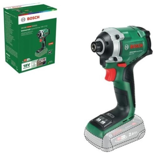 Акумулаторният ударен гайковерт BOSCH UID 18V-210 съчетава компактни размери и висока мощност, за да осигури бързо и надеждно завинтване и развиване. Работи с 18 V батерия (не е включена) и разполага с безчетков мотор, който достига въртящ момент до 210 Nm и максимална скорост от 3300 об/мин. Инструментът предлага две степени на регулиране на въртящия момент, което позволява по-добър контрол според конкретната задача, а захватът 1/4" вътрешен шестостен е съвместим с различни битове и накрайници. Благодарение на компактния дизайн работата в тесни пространства е улеснена, а интегрираното LED осветление осигурява добра видимост дори в слабо осветени условия. Моделът е част от системата POWER FOR ALL ALLIANCE и е съвместим с широка гама 18 V батерии и зарядни устройства. Доставя се без батерия и зарядно устройство.