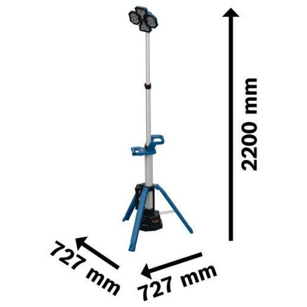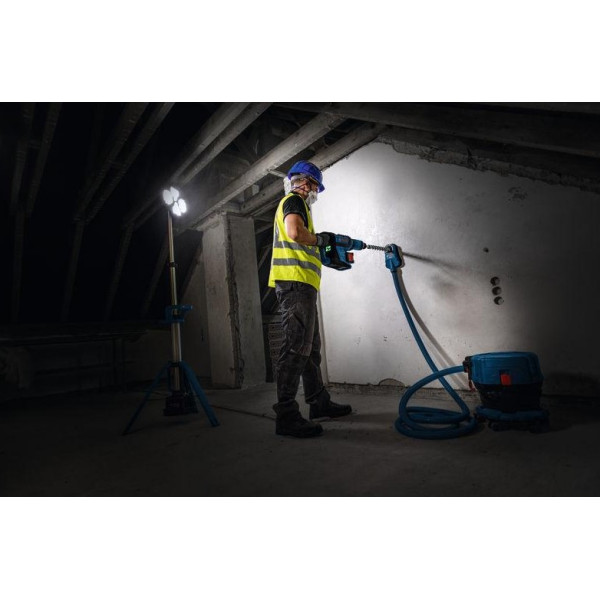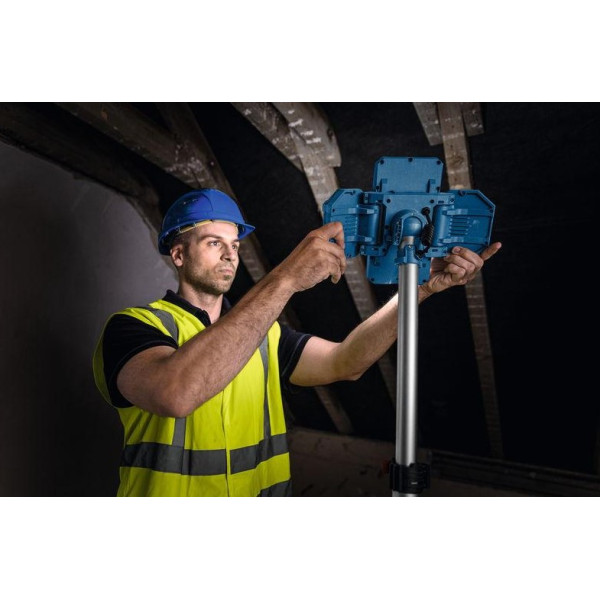 Акумулаторната лампа за строителна площадка BOSCH GLT 18V-5000 е професионално решение за мощно и равномерно осветяване на средни и големи работни зони. Лампата осигурява яркост до 5000 lm благодарение на 80 LED диода и предлага три нива на осветеност, което позволява лесно адаптиране към различни условия на работа. Телескопичният статив позволява осветяване от височина до 2,2 m, като по този начин се намалява рискът от заслепяване и се ограничават сенките върху работната зона. Многопосочната осветителна глава дава възможност трите светлинни секции да се насочват независимо, осигурявайки оптимално разпределение на светлината във всички посоки. Управлението с един бутон прави работата бърза и интуитивна, а настройката се извършва за по-малко от 15 s. Лампата се сгъва компактно за лесен транспорт и съхранение, като теглото от 6,2 kg я прави удобна за преместване между обекти. Здравата изработка с клас на защита IP54 осигурява устойчивост на прах и водни пръски, което я прави подходяща за взискателни строителни условия. BOSCH GLT 18V-5000 е съвместима с професионалната 18 V платформа и AMPShare и предлага надеждно, мобилно осветление за професионална употреба от серията на BOSCH. Доставя се без батерия и зарядно устройство!
