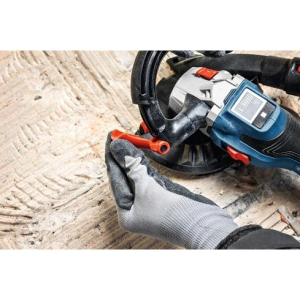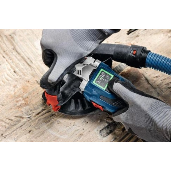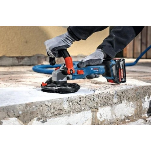 Бетон шлайфът BOSCH GBR 18V-15 S – Solo е професионален уред, създаден за ефективна обработка на бетон и различни минерални повърхности. Работи с 18 V батерия, която не е включена в комплекта, и използва диск с диаметър 125 mm и вътрешен отвор 22,2 mm, със шпиндел с резба M14. Мощният безчетков мотор гарантира висока производителност и дълъг експлоатационен живот, а регулираните обороти в диапазон от 2600 до 8500 об/мин позволяват оптимално настройване спрямо конкретната задача. За по-голяма безопасност инструментът разполага с плавен старт, а въртящата се допълнителна ръкохватка осигурява удобство при работа в ограничени пространства и допълнителна гъвкавост. Съвместимостта със системата Bosch Click & Clean дава възможност за свързване към прахосмукачка, като значително намалява праховите емисии по време на работа. Машината е подходяща за сухо шлайфане, изглаждане и почистване на бетон, камък, замазки и мрамор, както и за отстраняване на остатъци от лепила и защитни покрития. Доставя се в комплект с куфар и аксесоари, без батерия и зарядно устройство.