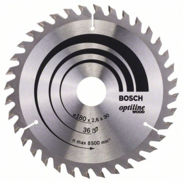Циркулярният диск BOSCH Ф180х2.6x30/20 Optiline Wood Z36 е за рязане на дърво и дървени материали с циркуляр. Диаметърът на диска е 180 mm, на вътрешния отвор - 30/20mm-с редуциращ пръстен и широчината на рязане е 2.6 mm. Дебелината на основния диск е 1.6 mm, а броя на зъбите - 36.