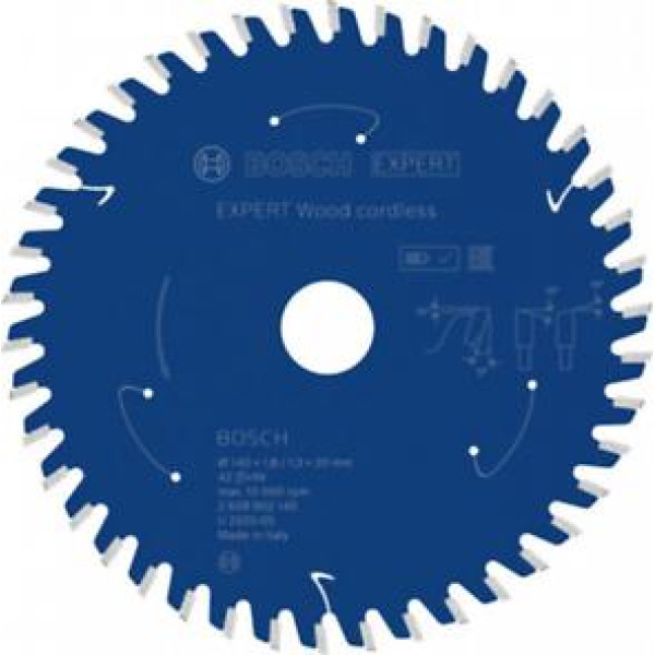 Дискът BOSCH Expert for Wood е предназначен за рязане с акумулаторни циркуляри. Има диаметър 140 mm, вътрешен отвор 20 mm и 42 зъба с форма ATB. Дебелината му е 1,3 mm, а широчината на рязане 1,8 mm. Може да се използва при максимални обороти до 10000 min-1. Циркулярният диск е подходящ за рязане на дърво и дървени материали.