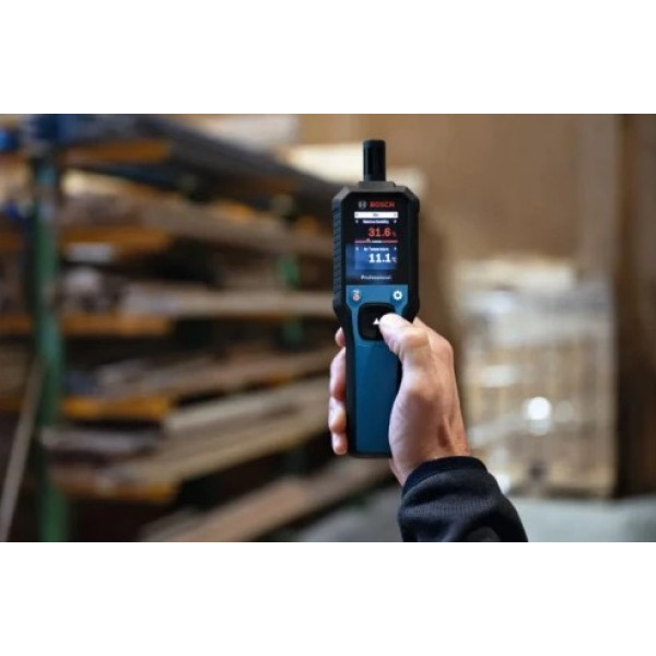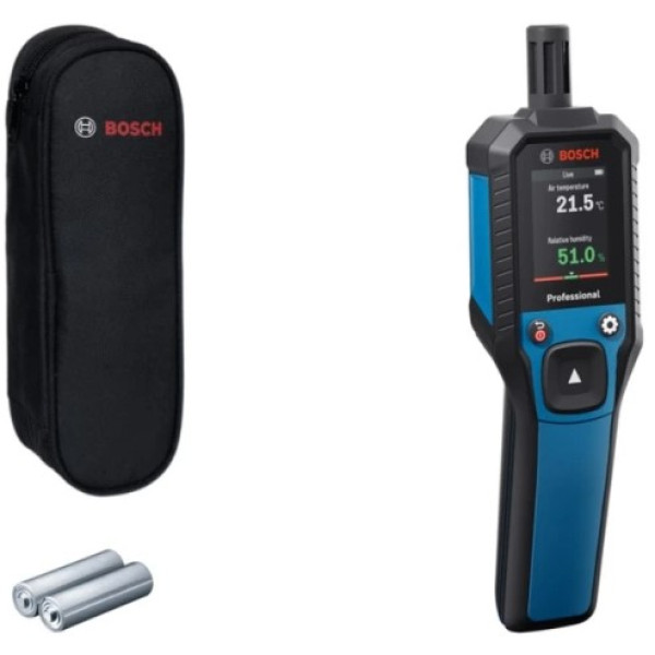 Хигрометърът BOSCH GDH 1-17 е професионален инструмент за точно измерване на температурата и относителната влажност на въздуха, подходящ за строителство, поддръжка на сгради, климатични системи и други приложения, при които е необходим надежден контрол на условията. Той измерва температура в диапазон от –20 °C до +50 °C с точност ±0.4 °C и влажност от 5% до 95% RH с точност ±2.5% RH, осигурявайки прецизни и достоверни резултати. Уредът е оборудван с цветен TFT LCD дисплей с диагонал 2.0" и резолюция 240 × 320 пиксела, който предлага ясна и удобна визуализация на данните. Здравата конструкция с гумено покритие и защита IP65 гарантира устойчивост на прах и водни пръски, което прави модела подходящ за работа и в по-тежки условия. BOSCH GDH 1-17 се захранва от 2 батерии 1,5 V LR6 (AA), работи при температури от –20 °C до +50 °C и може да се съхранява при температури от –20 °C до +70 °C, което осигурява надеждност и дълъг експлоатационен живот.