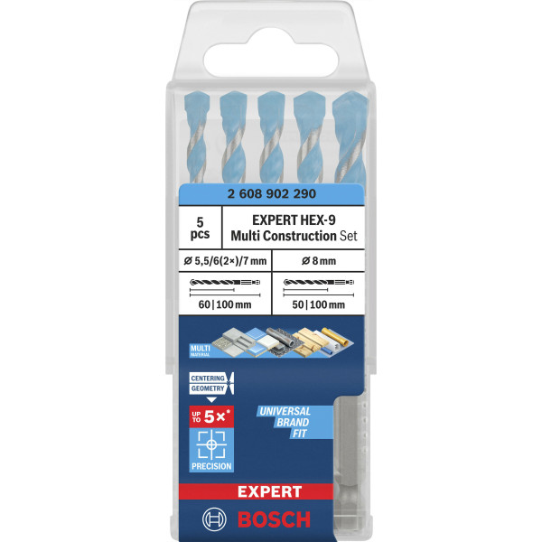Комплектът BOSCH EXPERT HEX-9 Multi Construction е универсален набор от 5 висококачествени свредла, проектирани да улеснят прецизното пробиване в различни материали, които често се срещат при строителни, монтажни и ремонтни задачи. Свредлата са с шестостенна опашка (HEX 9) за здраво захващане и максимално предаване на въртящия момент както при стандартни трикулачкови патрони, така и при държачи с вътрешен ¼“ шестостенен интерфейс, което прави комплекта съвместим с широка гама винтоверти и бормашини. Всяко свредло е с оптимизирана геометрия и центриращ връх, която гарантира точен старт на отвора без приплъзване, а карбидният връх, произведен чрез фино шлифоване, осигурява висока ефективност и устойчивост при пробиване. Това подобрява управлението на стружките и води до по-бързо и чисто пробиване дори в по-трудни материали. Комплектът включва свредла с диаметри 5.5 mm, два броя 6 mm, 7 mm и 8 mm, като работните дължини са съобразени за универсална употреба, а общата дължина отговаря на нуждите при различни монтажни условия.