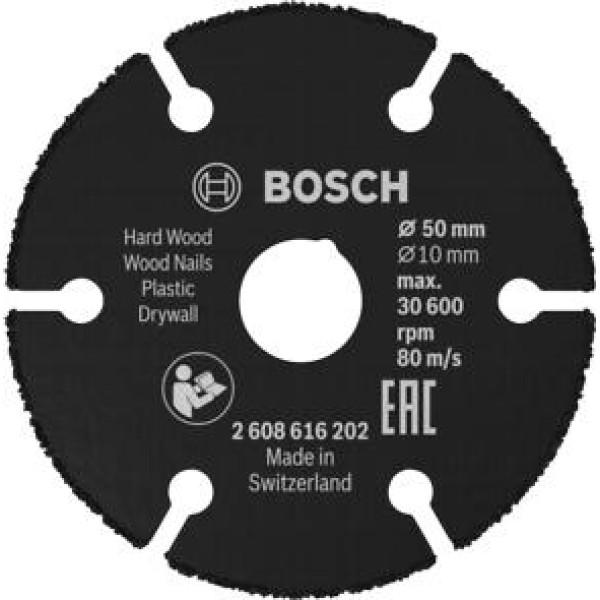 Отрезен диск BOSCH Carbide Multi Wheel с диаметър 50 mm и вътрешен отвор 10 mm, предназначен за рязане на дърво и пластмаса с акумулаторен ъглошлайф BOSCH Easy Cut&Grind.