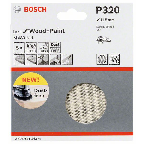 Шкурката тип мрежа BOSCH M480 P320 е с диаметър 115 mm и зърненост 320. Тя е предназначена за ексцентършлайф. Подходяща е за дърво, боя, лак, грунд, кит. В окомплектовката са включени 5 броя шкурки.