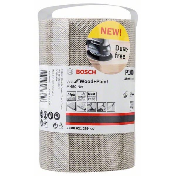 Шкурката BOSCH M480 P100 е навита на руло и е с размер 115 mm х 5 m и зърненост 100. Подходяща е за дърво, боя, лак, кит, грунд, кориан.