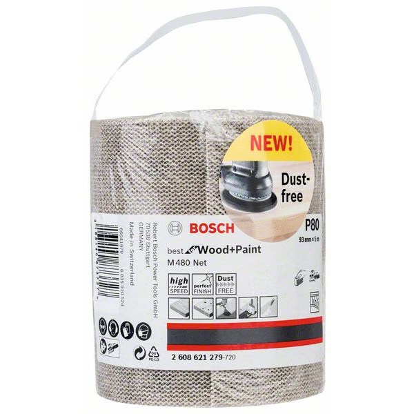 Шкурката BOSCH M480 P80 е навита на руло и е с размер 93 mm х 5 m и зърненост 80. Подходяща е за дърво, боя, лак, кит.