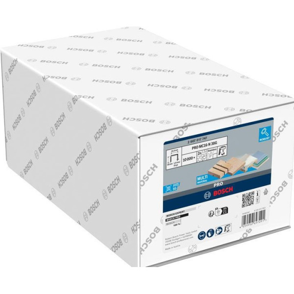 Скобите за такер BOSCH PRO MC16-N 38G с дължина 38 mm са предназначени за здраво и надеждно закрепване при работа с дърво и гипсокартон. Тип MC16-N с широчина 10,8 mm и дебелина 1,6 mm осигурява стабилно фиксиране и добра устойчивост при натоварване, а търговската опаковка от 10 000 броя ги прави подходящи за професионална и интензивна употреба.