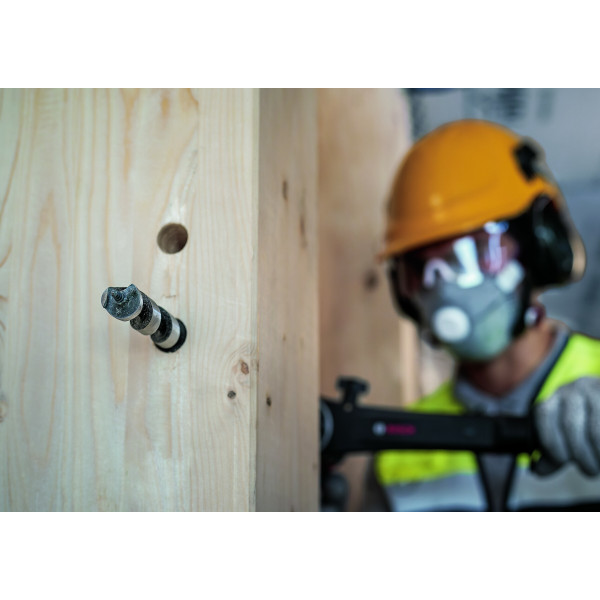 Винтовото свредло BOSCH PRO Wood с шип, 24 x 385 x 450 mm е професионален инструмент, предназначен за пробиване на големи и дълбоки отвори в дърво. С диаметър 24 mm, работна дължина 385 mm и обща дължина 450 mm, то е подходящо за работа с масивна дървесина, греди и дървени конструкции, при които се изисква висока прецизност и стабилност. Центриращият шип осигурява точно позициониране и предотвратява приплъзване в началото на пробиването, а винтовата спирала позволява бързо и равномерно отвеждане на стружките, което улеснява дълбокото пробиване. Свредлото е проектирано за чисто и контролирано рязане както в мека, така и в твърда дървесина, като намалява усилието при работа и осигурява постоянен диаметър на отвора. Изработено по стандартите на серията BOSCH PRO, то се отличава с висока износоустойчивост и надеждност, което го прави подходящо за професионални дърводелски, строителни и монтажни приложения, при които се изисква голям обхват и сигурни резултати.